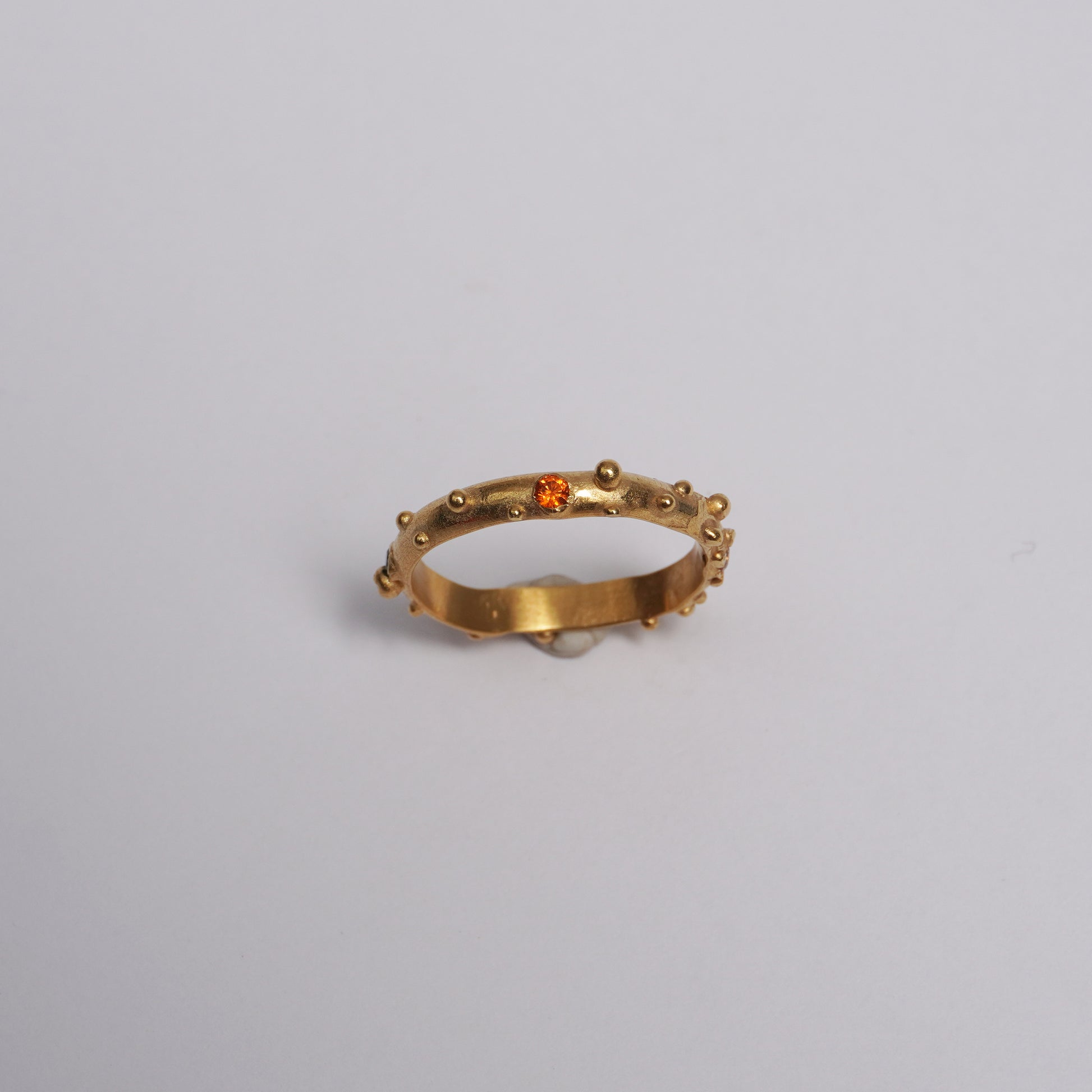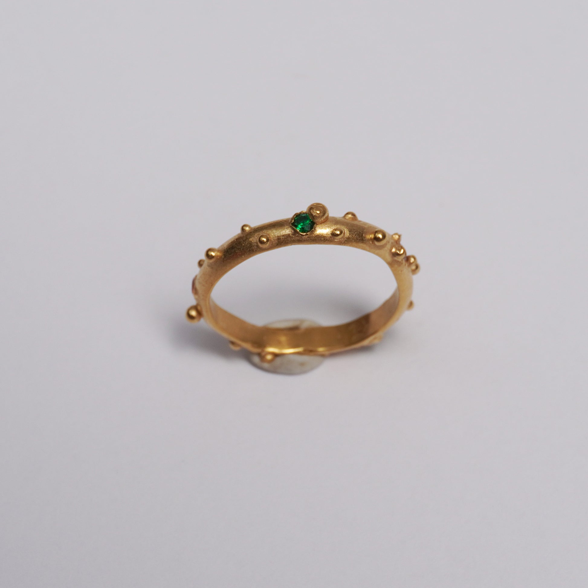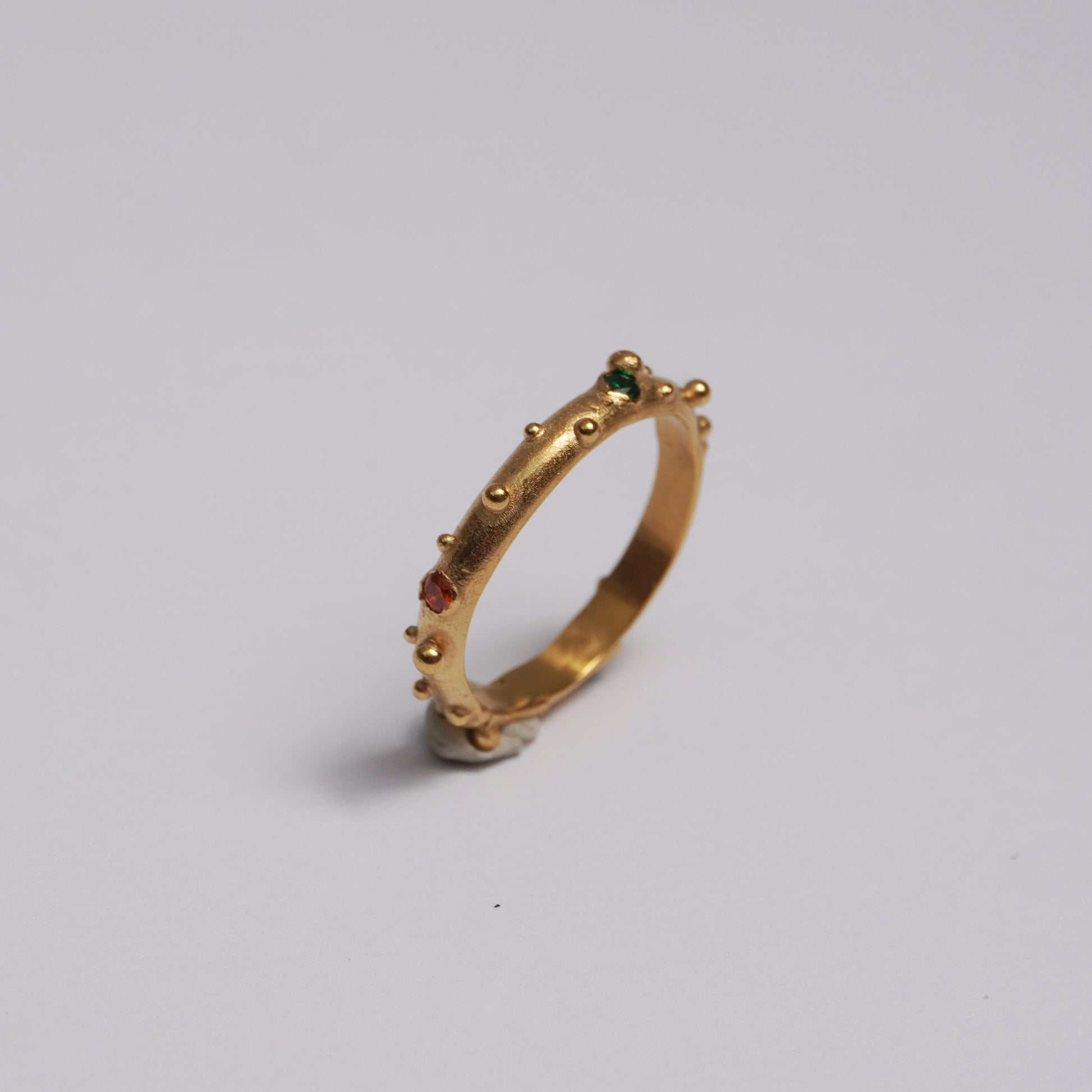 This one-of-a-kind ring is made from 24k gold-plated brass using the lost-wax casting technique. It features a slim band with scattered raised dots inspired by the structure of traditional rosary beads and three small stones – two in emerald green, the other in warm orange.