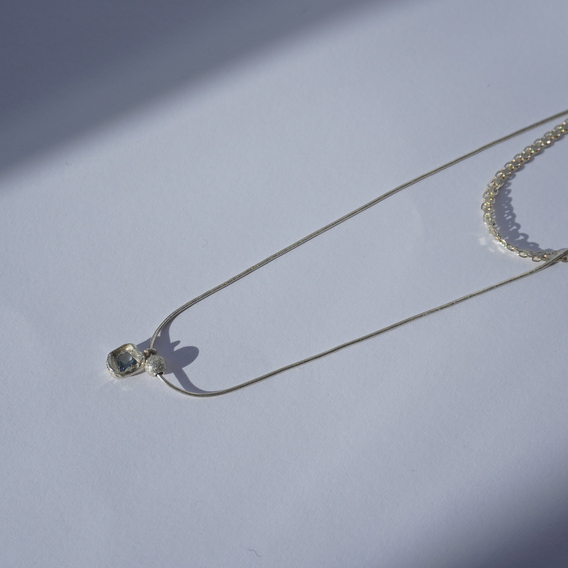 Necklace with a double chain featuring a square small pendant stone with a sphere organically textured surface. Short chain 33cm, long chain 45cm.
