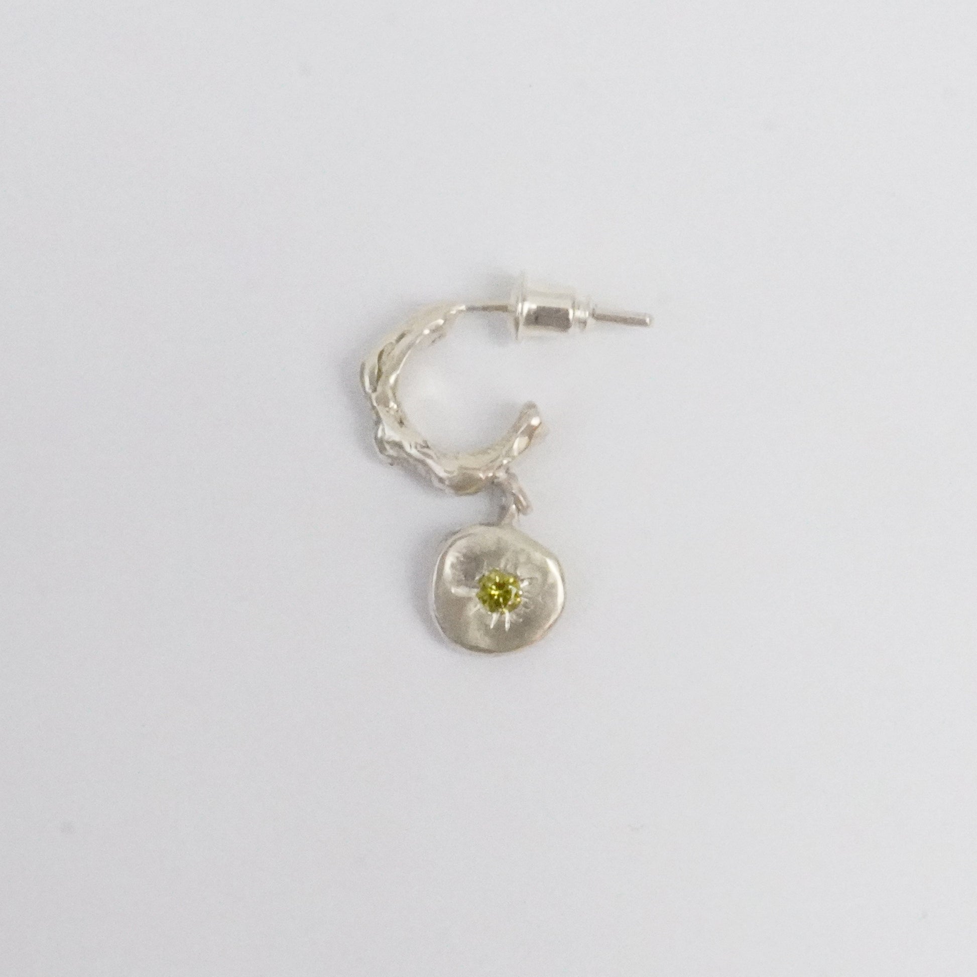 Handmade organic hoop earring featuring a circle-shaped charm set with a synthetic zirconia.