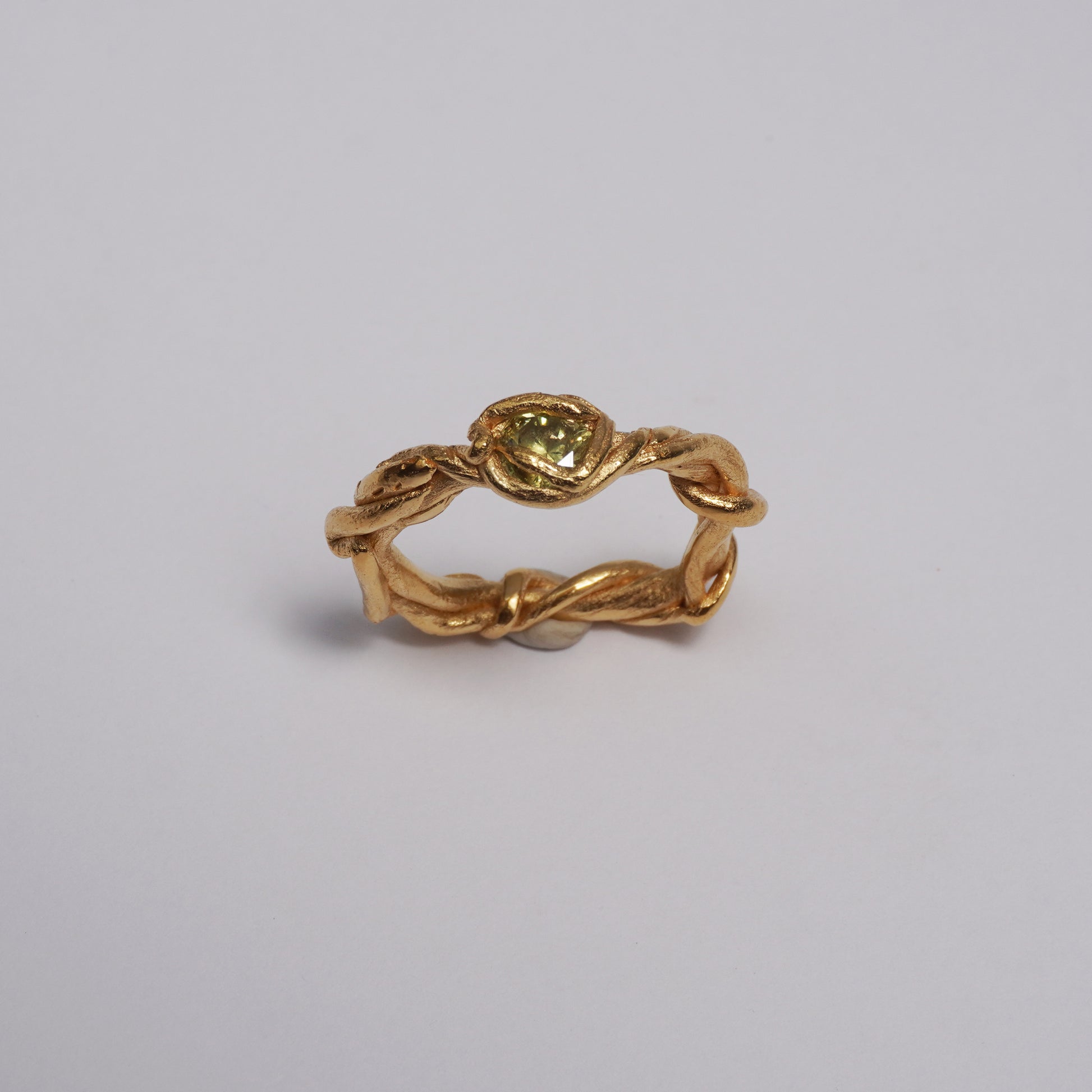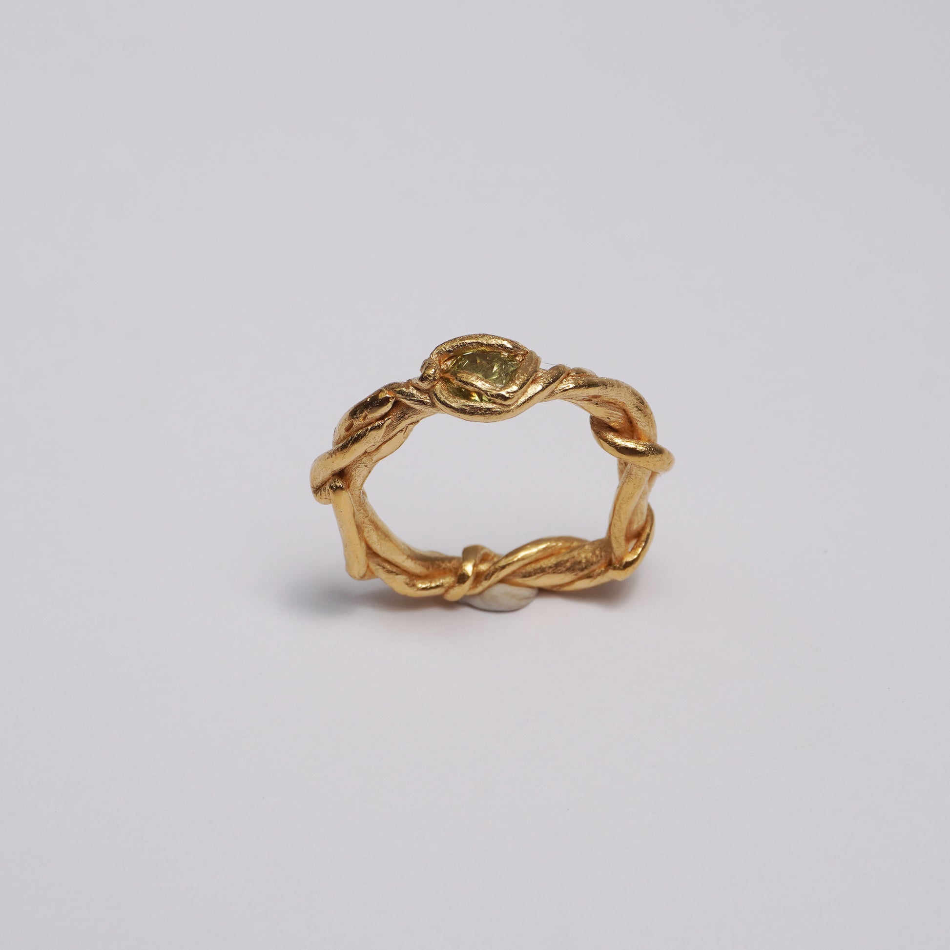 This one-of-a-kind ring is made from 24k gold-plated brass using the lost-wax casting technique. It features a twisted, vine-like band and a green stone set into the center. The design combines organic shapes with a sculptural surface, giving the piece a detailed and earthy feel.