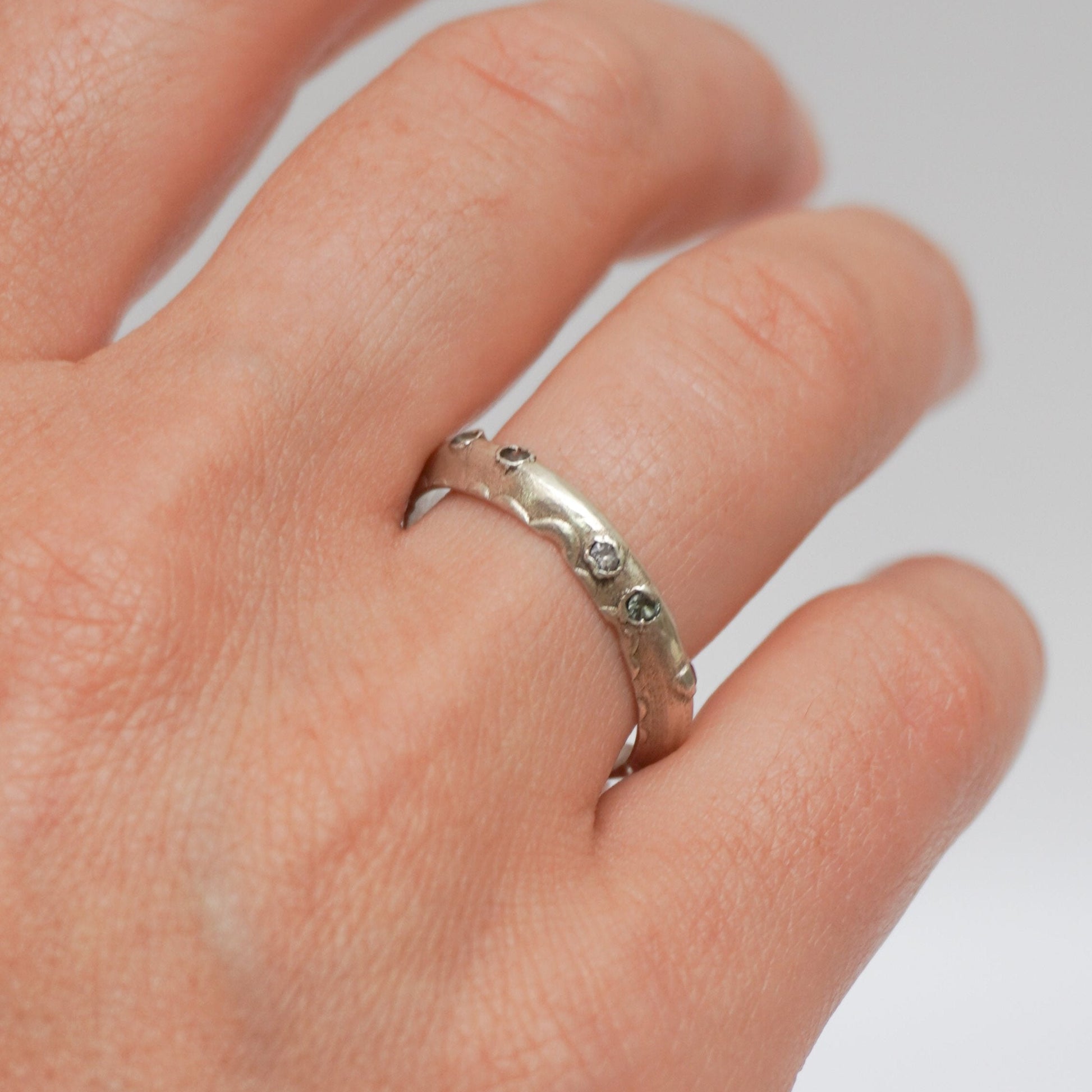 This one-of-a-kind ring is made from premium sterling silver using the lost-wax casting technique. It features an organic band with slight surface irregularities and five small zirconia stones set across the top for subtle sparkle and detail.