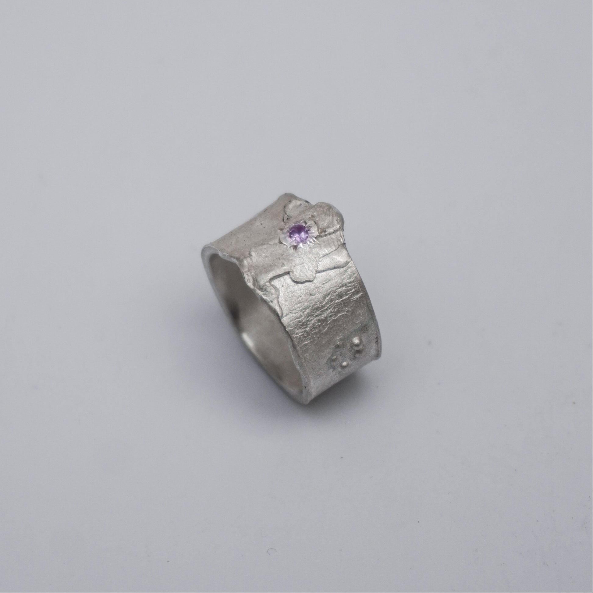 This one-of-a-kind ring is made from solid 925 sterling silver using the lost-wax casting technique. It features a wide, flat band with layered textures, dot accents, and a small violet zirconia stone set into a raised, organic form.