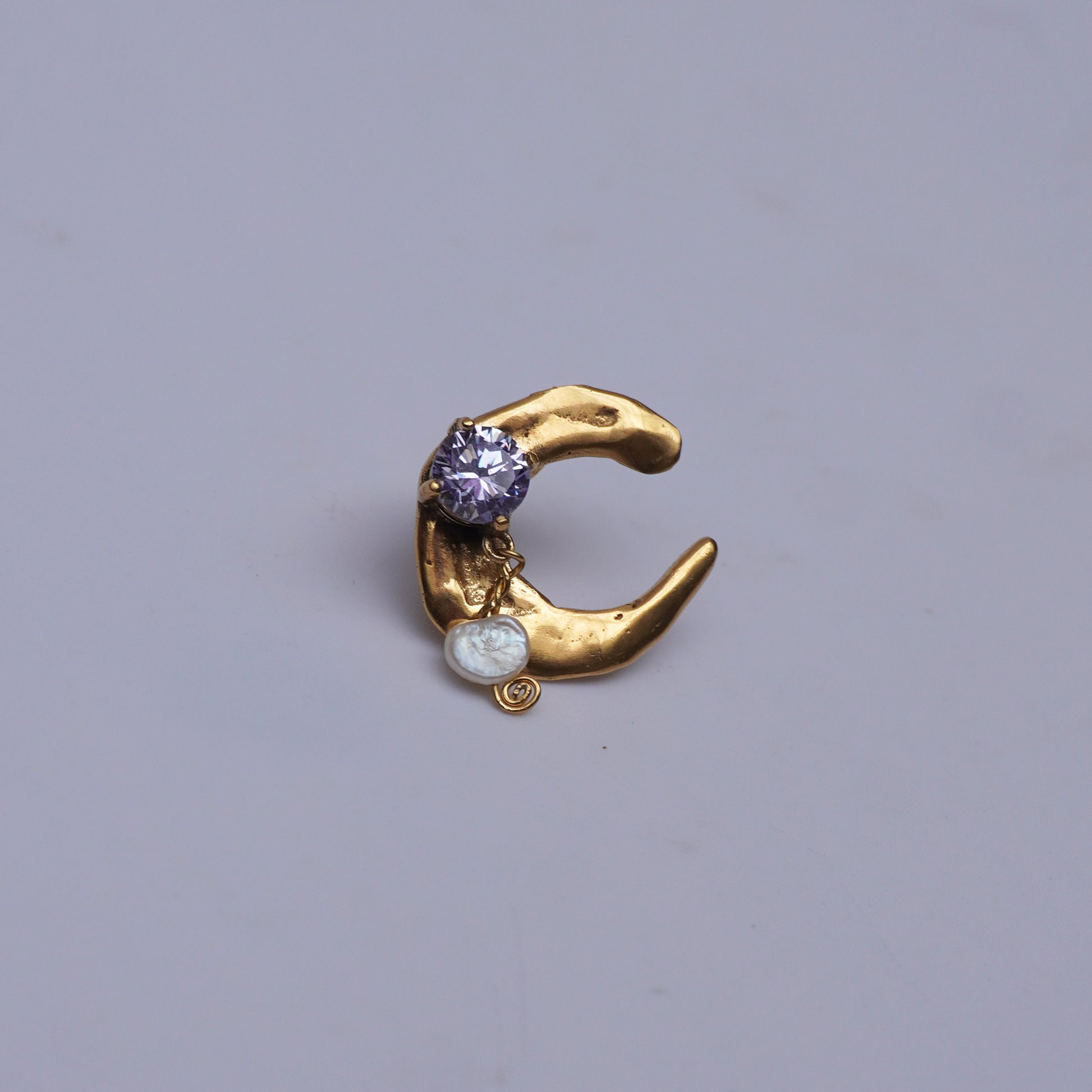 Single stud earring with organic moon shape with cubic zirconia stone and natural fresh pearl.