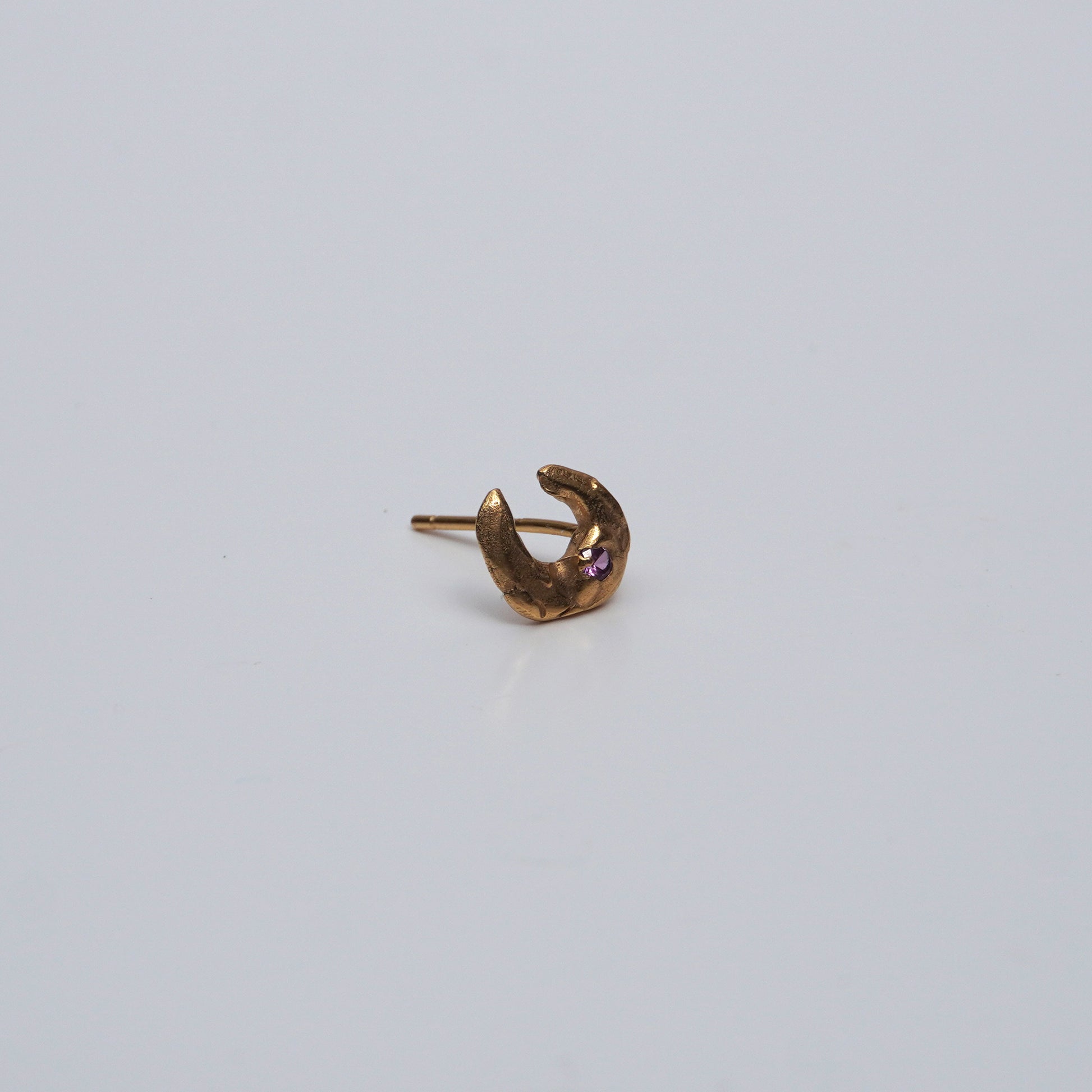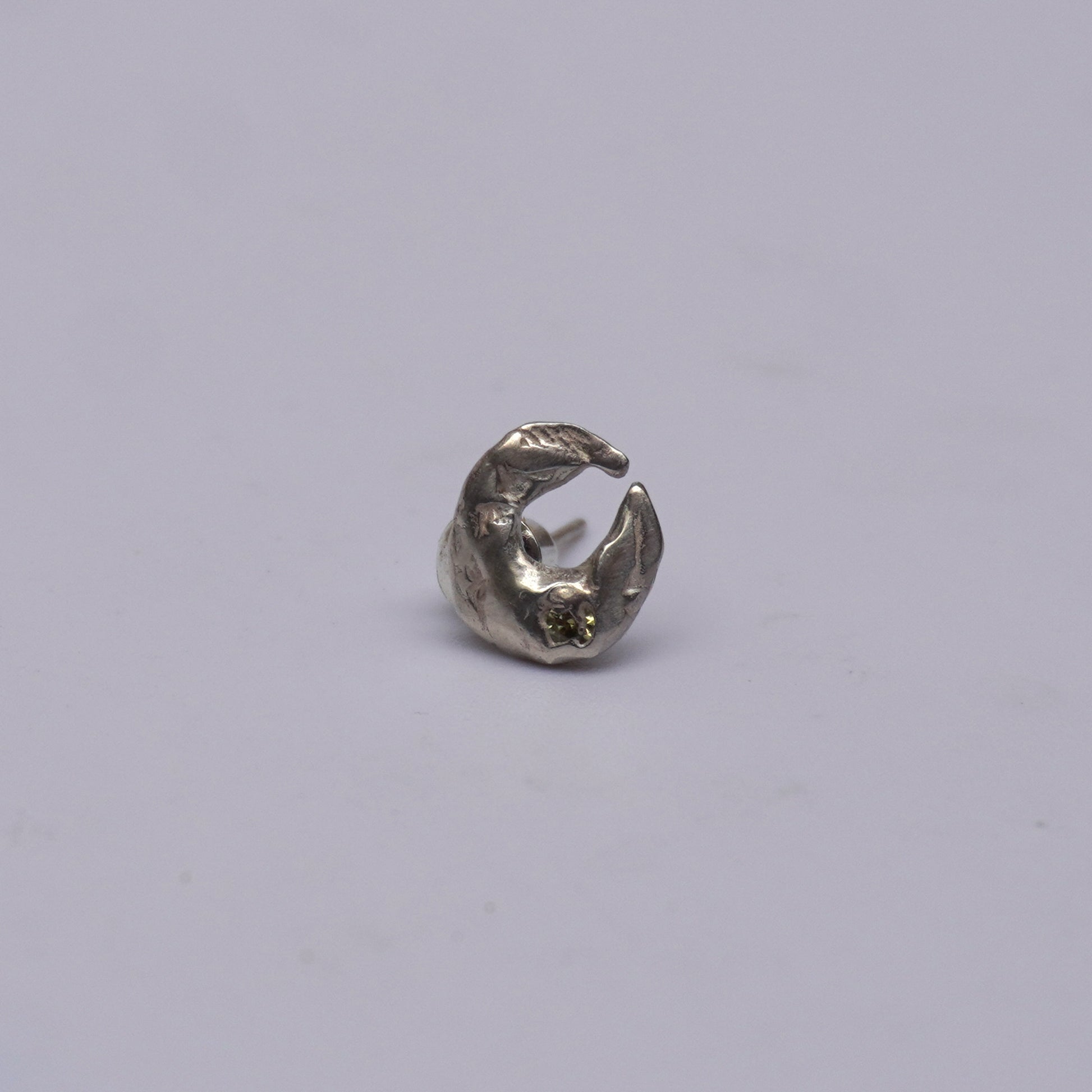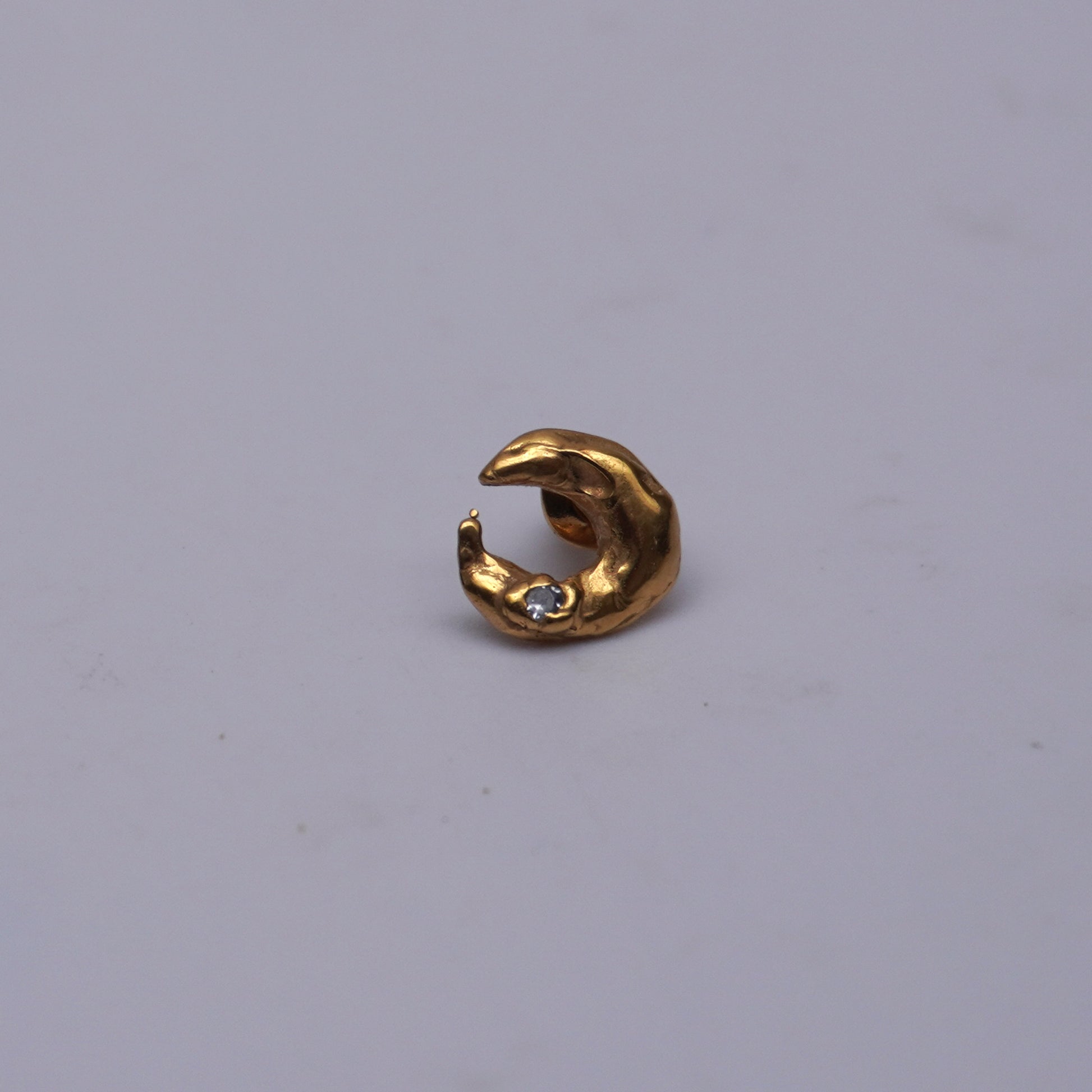 Single stud earring with organic moon shape with cubic zirconia stone.