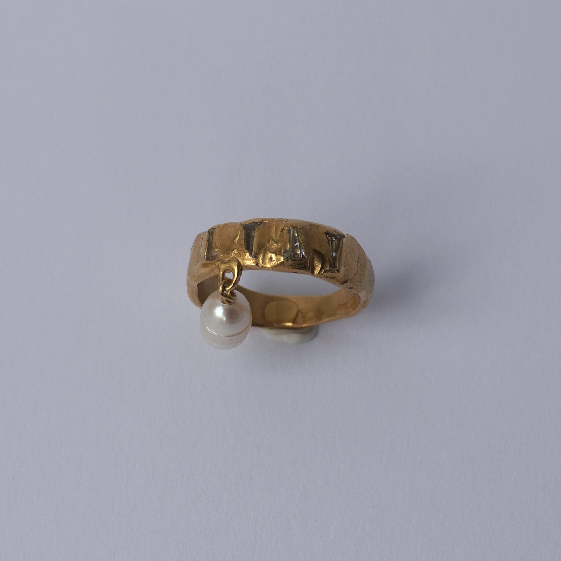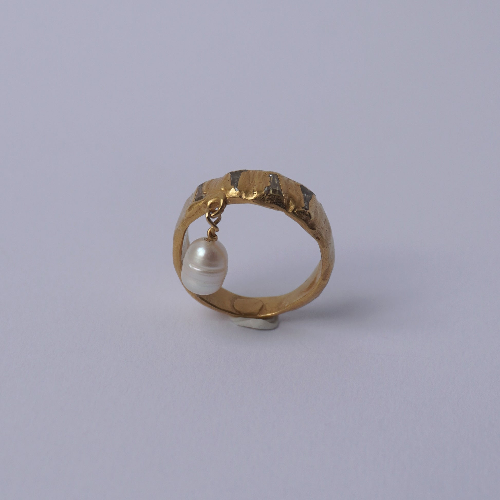 This delicate ring is made from 24k gold-plated brass using the lost-wax casting technique. It features four clear organic set zirconia stone and a freely hanging freshwater pearl.