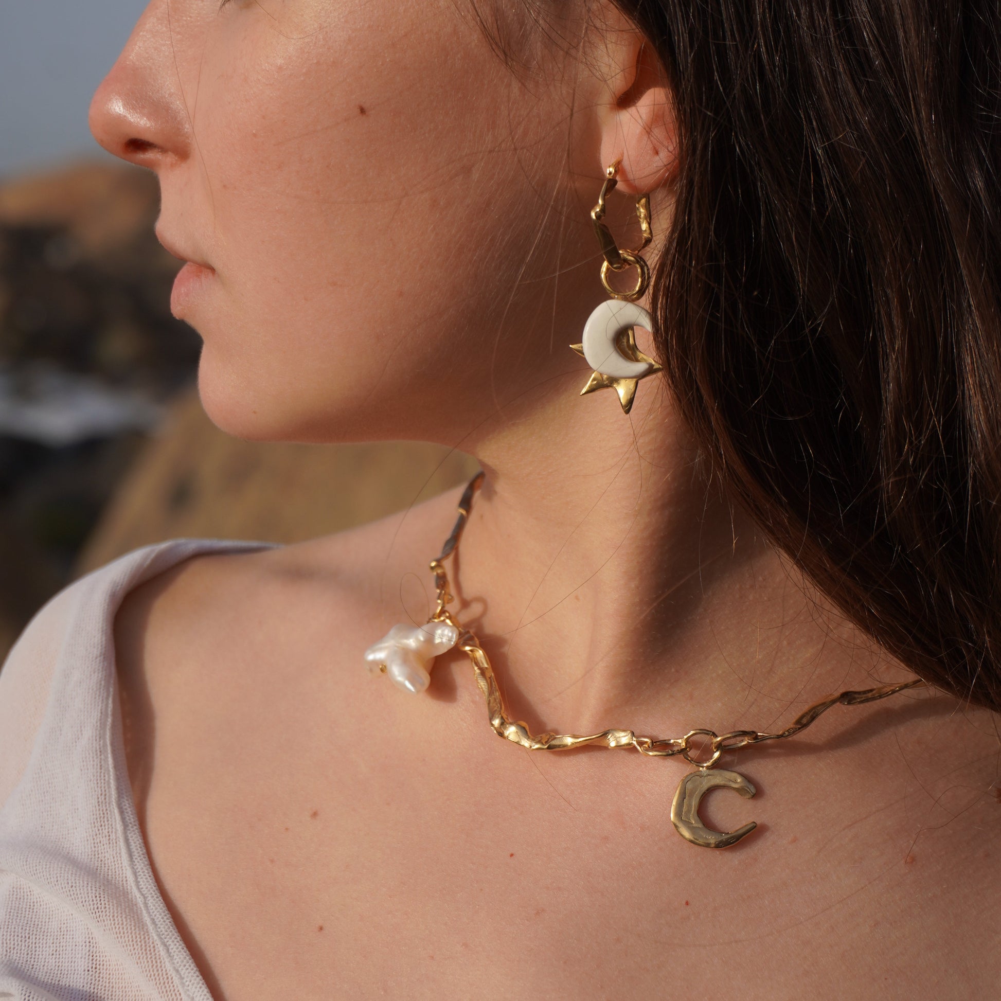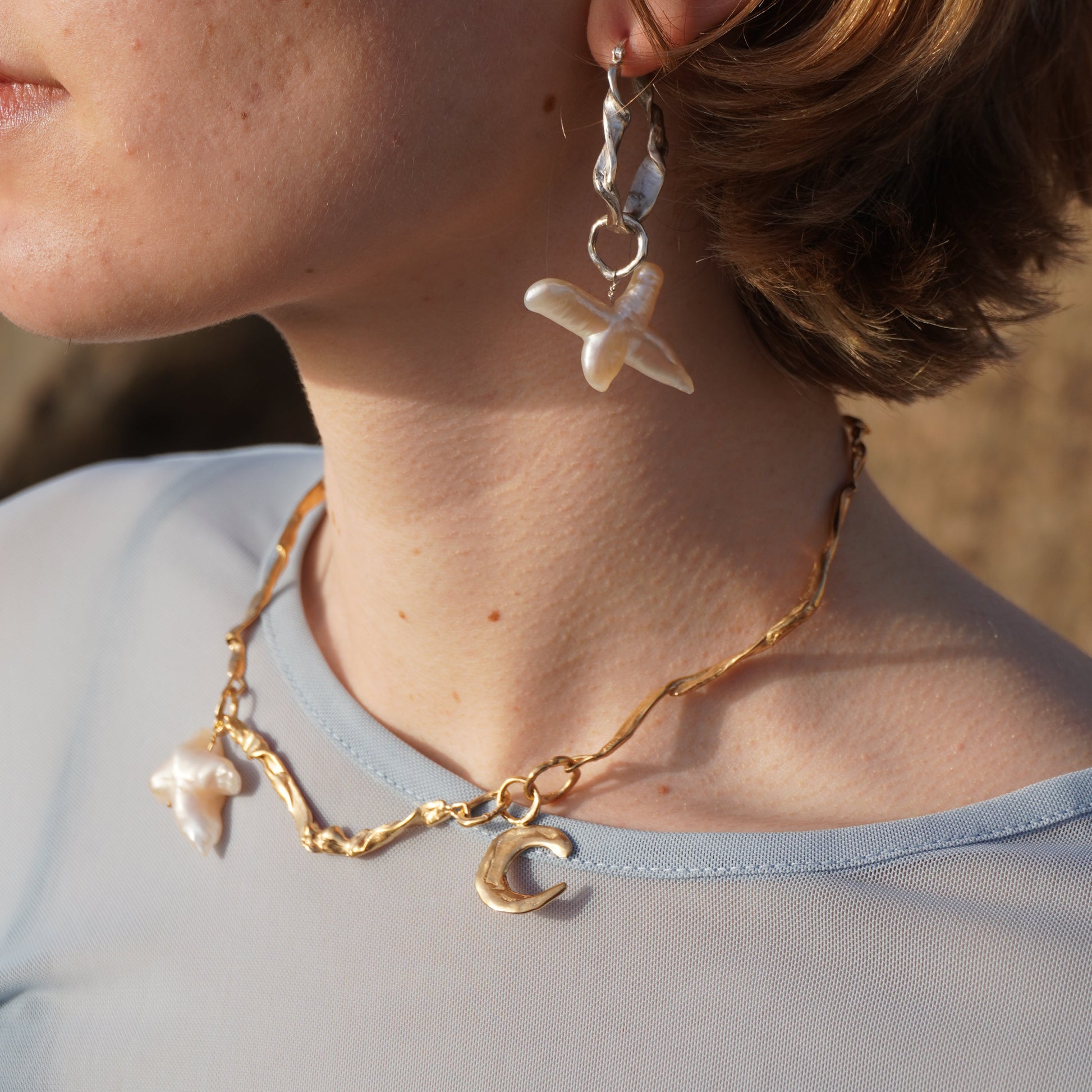 Gold-plated or silver necklace with natural baroque fresh water pearl and metal pendant.