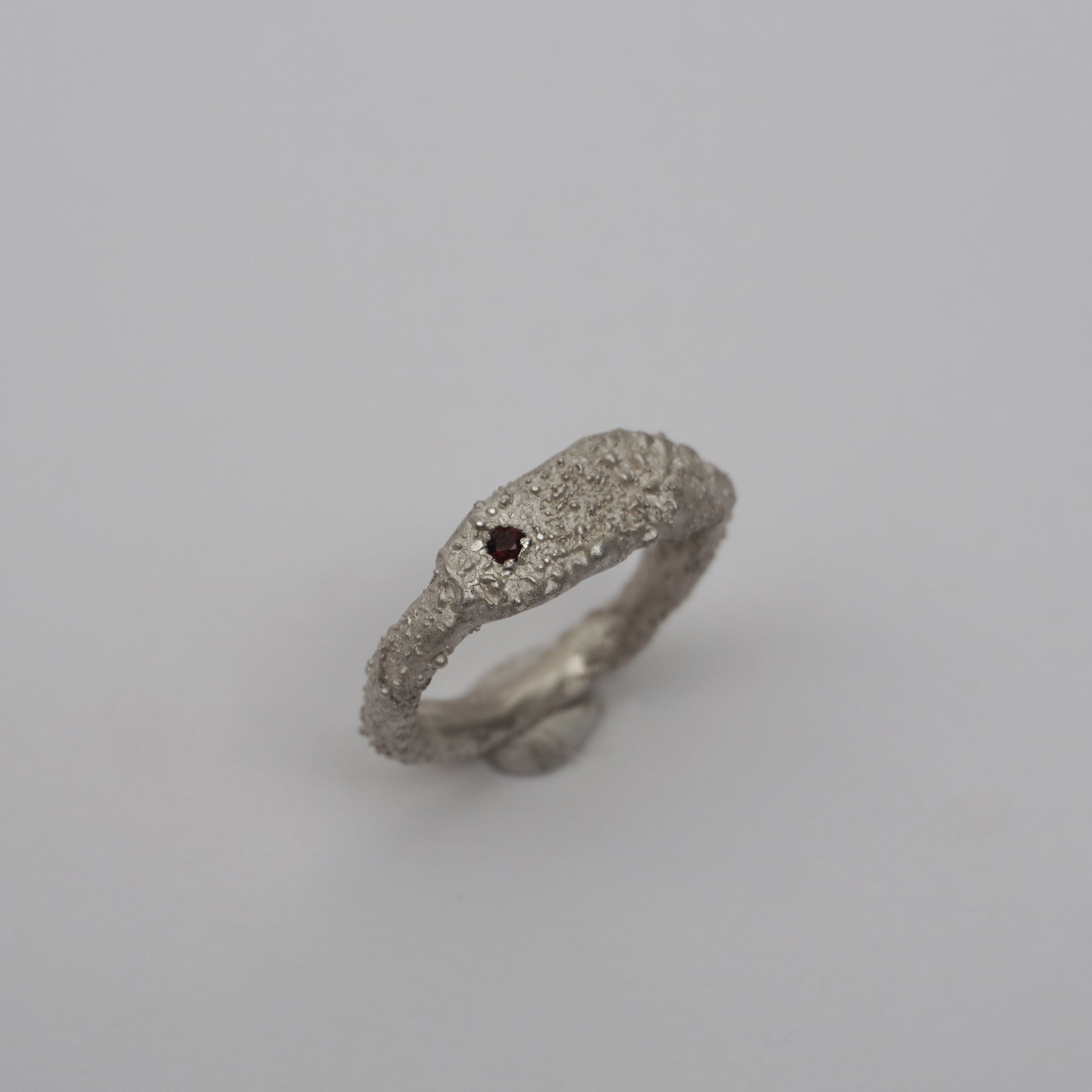 This one-of-a-kind ring is handcrafted from solid 925 sterling silver using the lost-wax casting technique. It features a raw, textured band with an embedded deep red natural garnet stone, adding a striking highlight to the rugged surface.